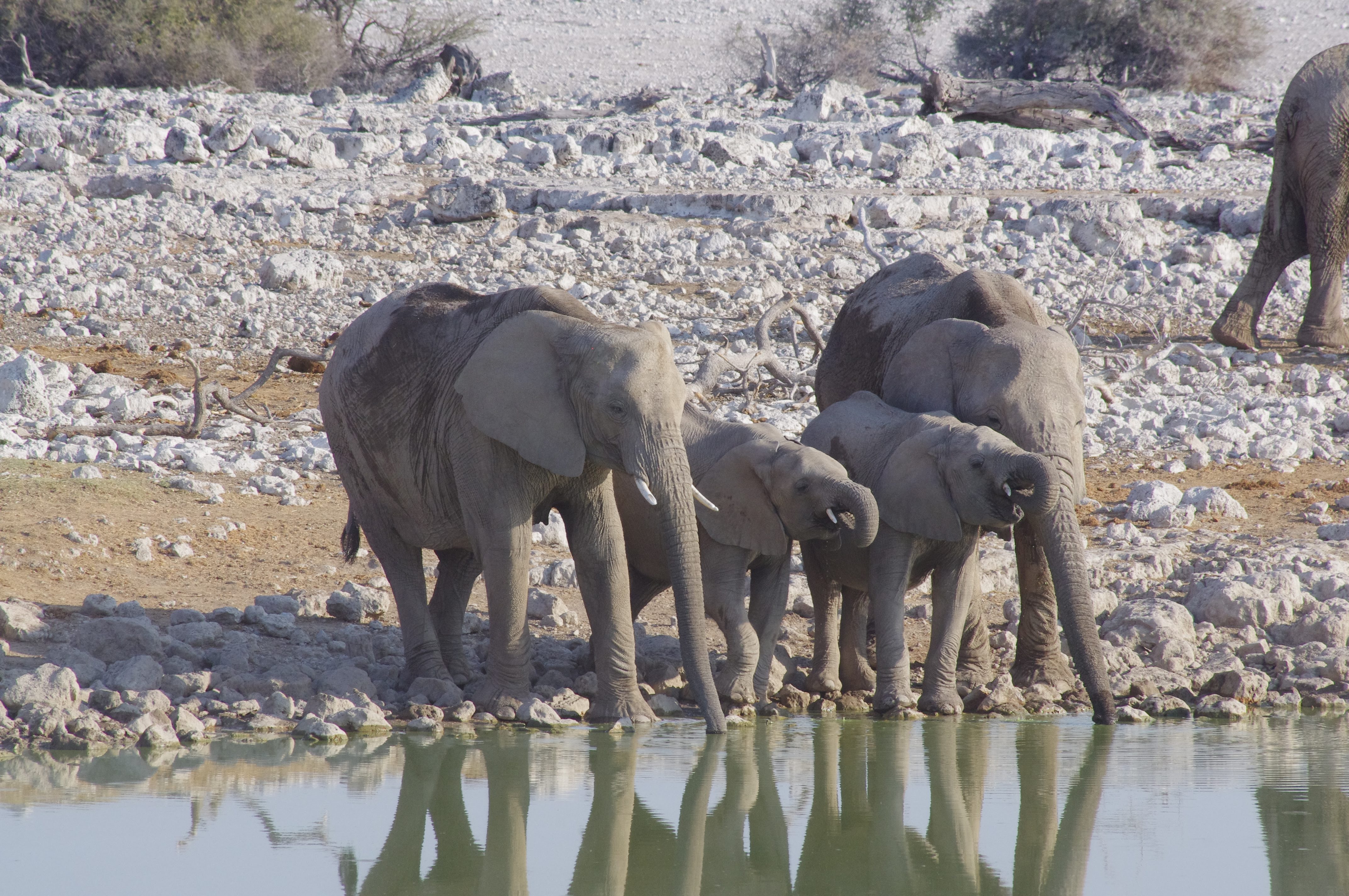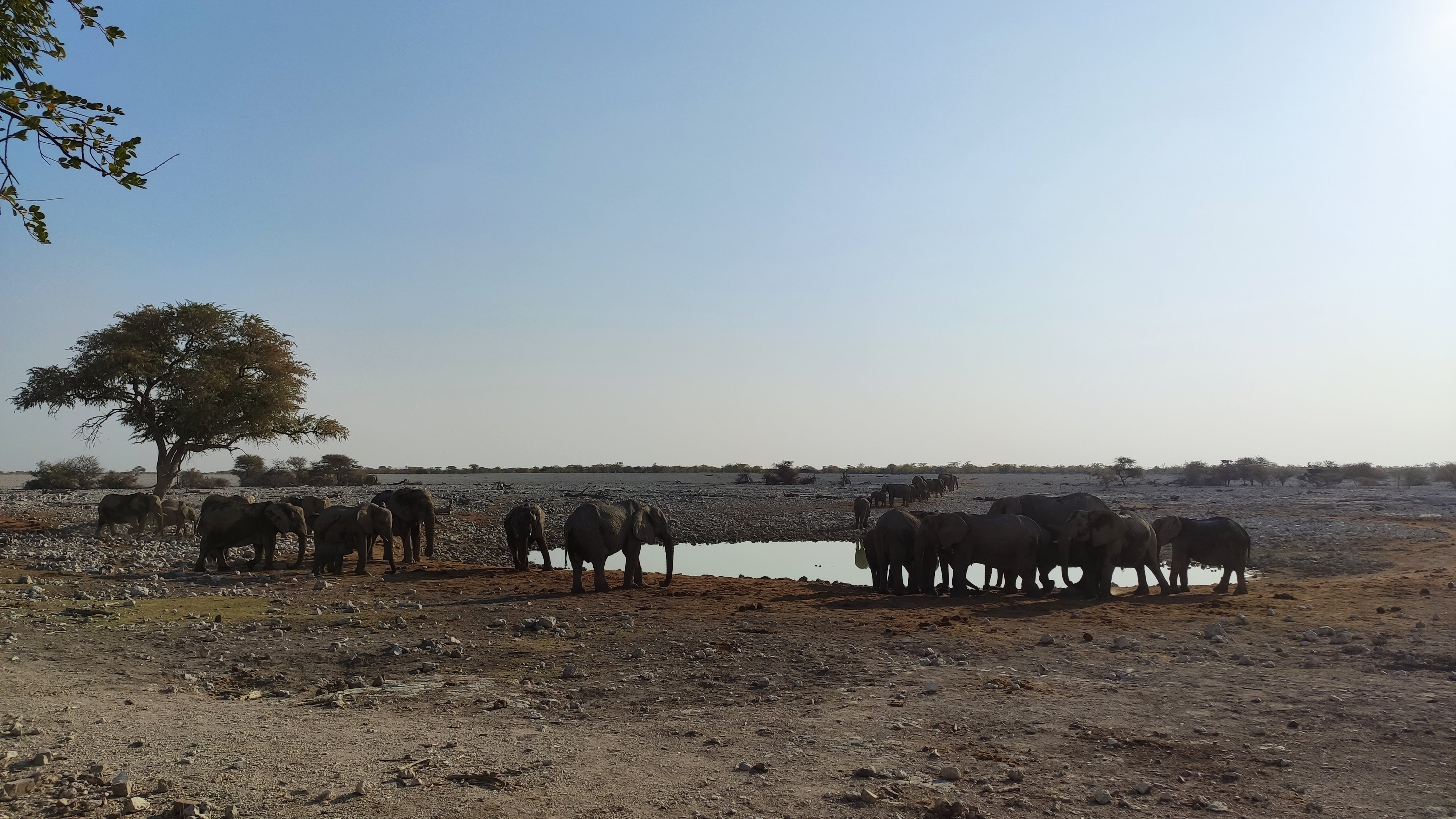 Une fois arrivés, nous sommes sous le charme : un troupeau entier d’éléphants est au point d’eau.
