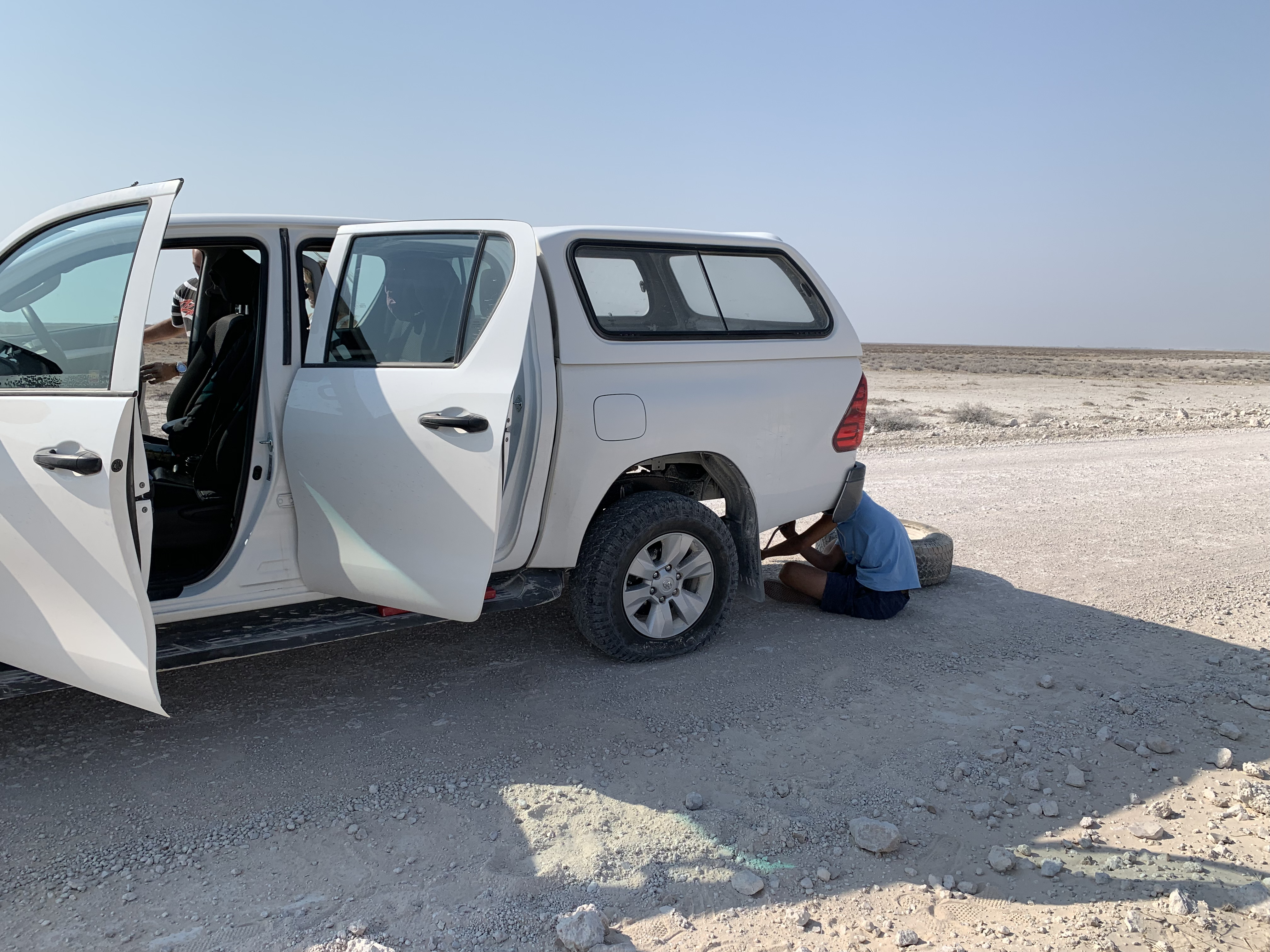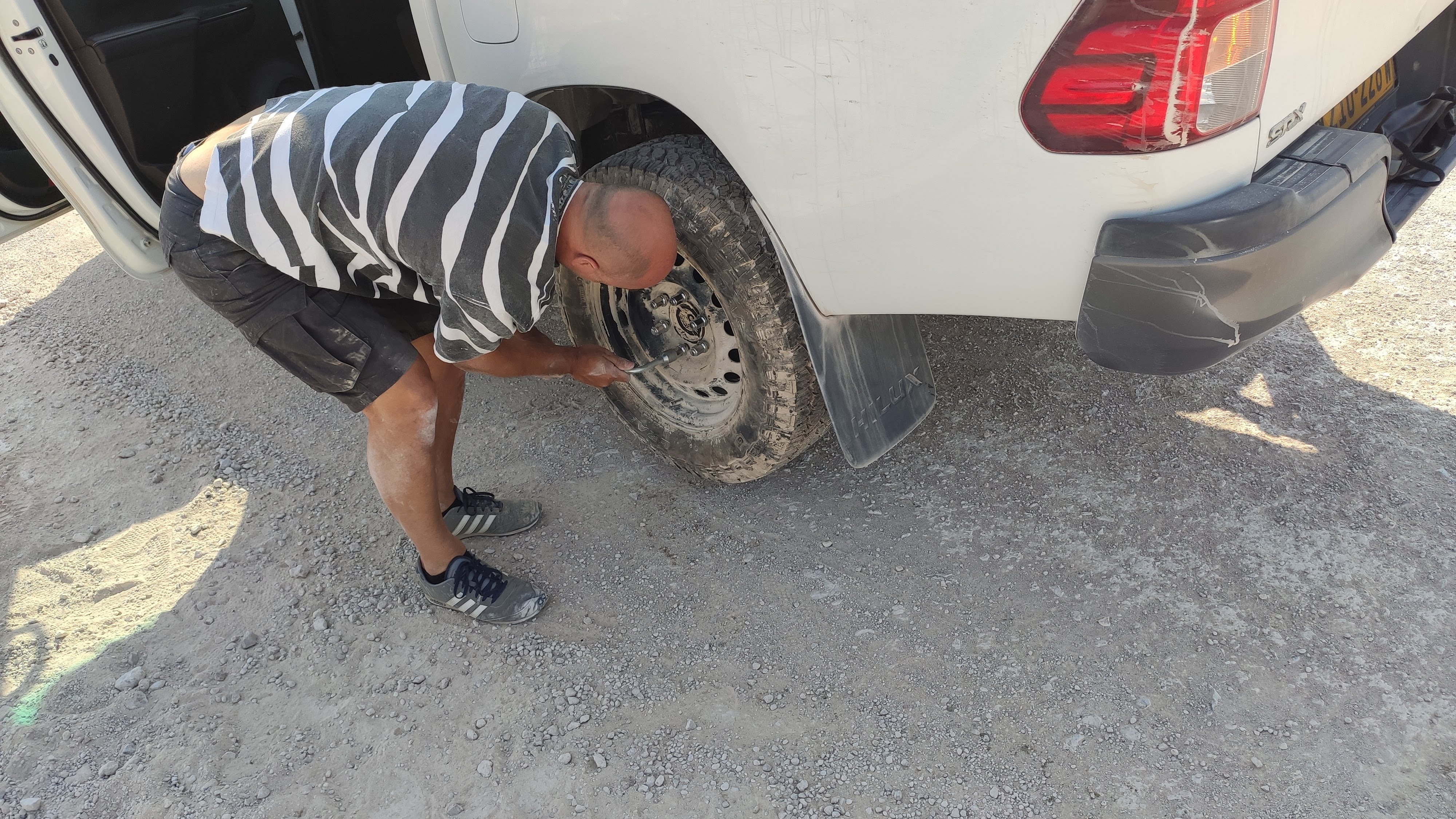Nous croisons un guide qui conduit un 4×4 de tourisme qui nous indique que dans ce cas-là, pas le choix, on doit changer le pneu. Les femmes feront le guet pendant que les hommes changerons le pneu.