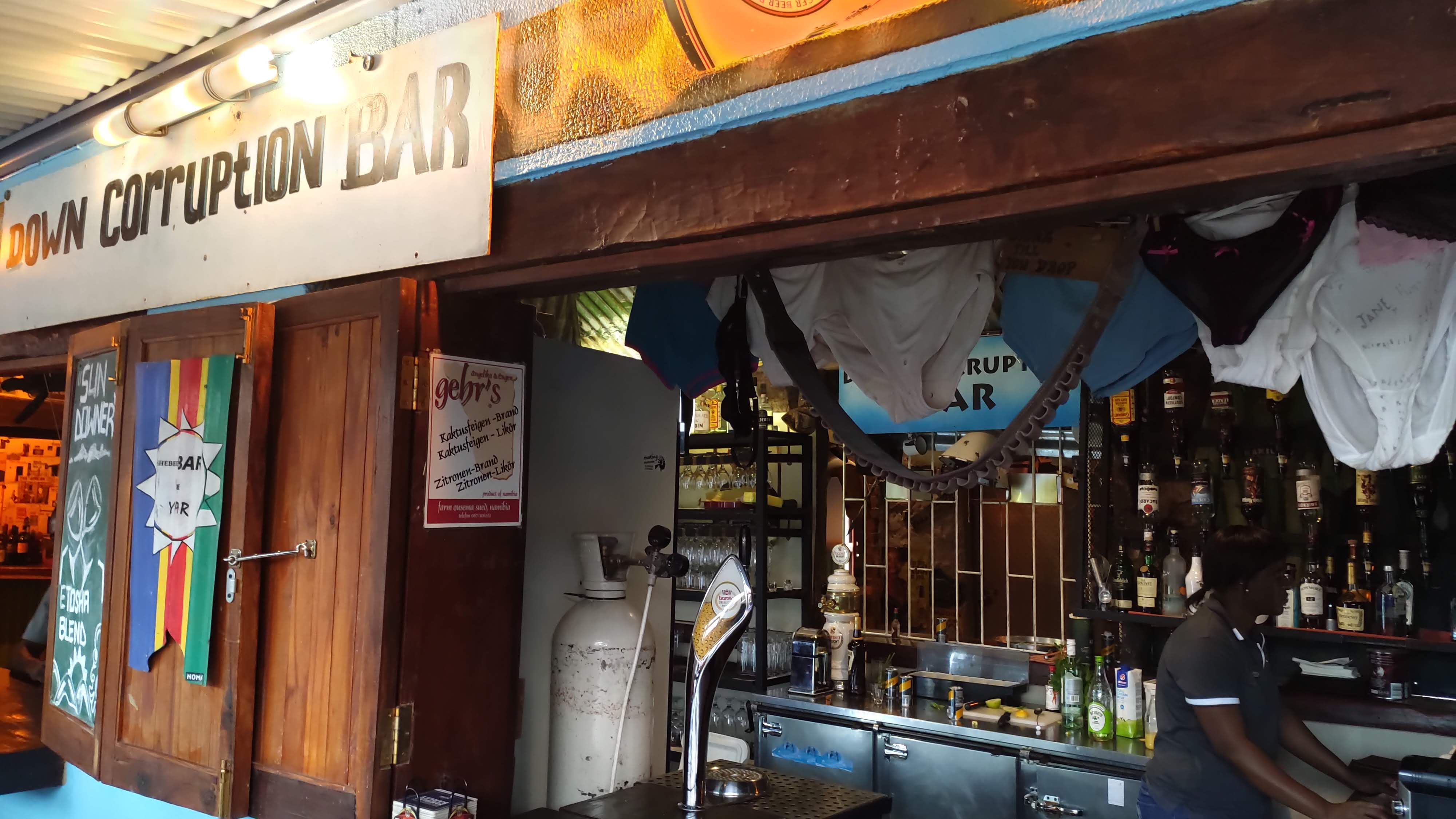 La décoration est faite de matériaux de récupération pour donner une ambiance township. On a de tout : sièges faits dans des pneus, tôle ondulée, affiches de propagande, bidons, guirlandes électriques et même des slips étendus dans le bar. Original.