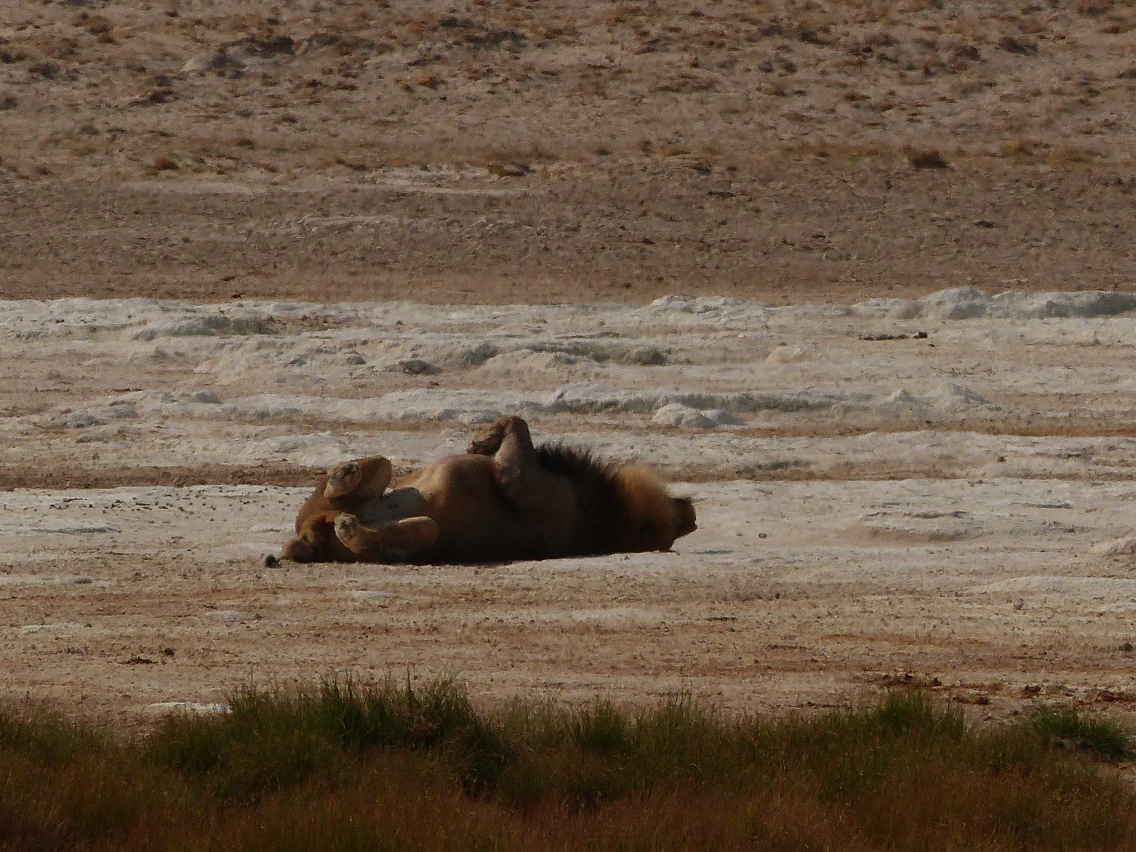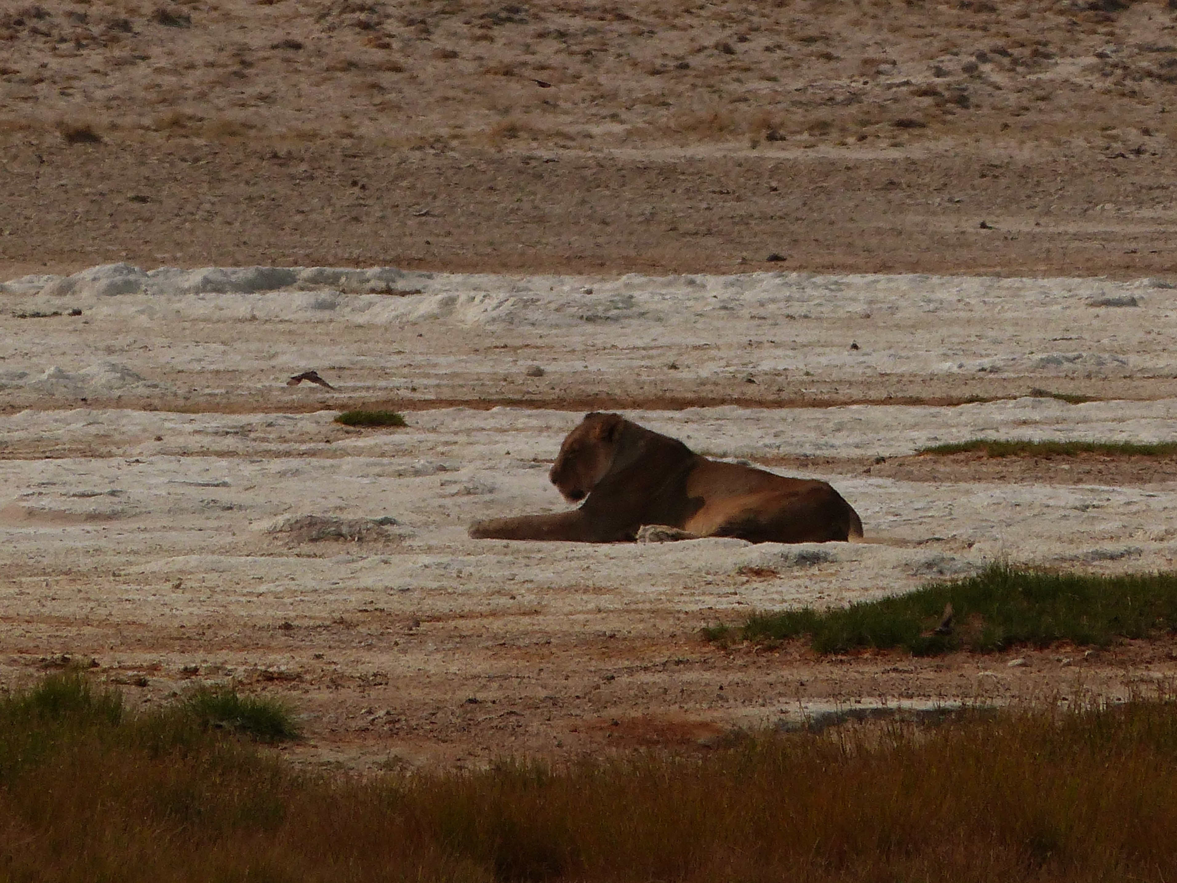Arrivés au point d’eau, nous sommes immédiatement récompensés puisqu’une lionne et un lion se prélassent, certainement après leur petit déjeuner. Ils ne sont pas sous notre nez, mais les objectifs de nos appareils photo serons suffisants.