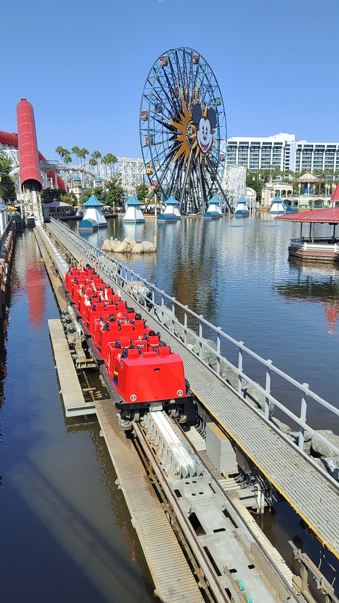 Il est temps de nous diriger vers le Pixar Pier et de se trouver face à l’icone du parc, la grande roue avec le visage de Mickey et la montagne russe blanche derrière.