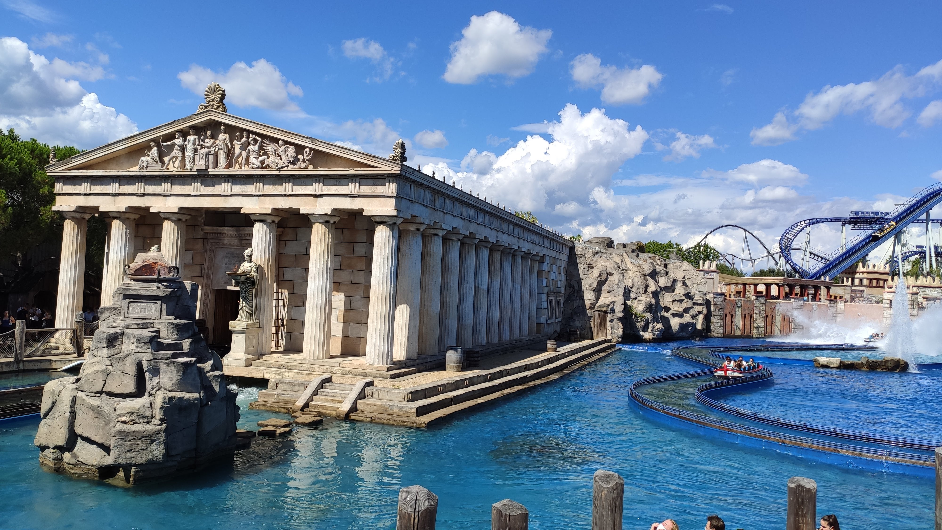 Pour nous remettre de nos doubles émotions, nous nous promenons un peu dans le parc. La décoration est vraiment réussie. Nous passons d’un pays à l’autre, Hollande (où nous ferons Pirates of Batavia, un Pirates des Caraïbes au rabais…), Grande-Bretagne, Russie, pour finir en Grèce où nous nous décidons à enfin nous mouiller avec le grand huit Poseidon.