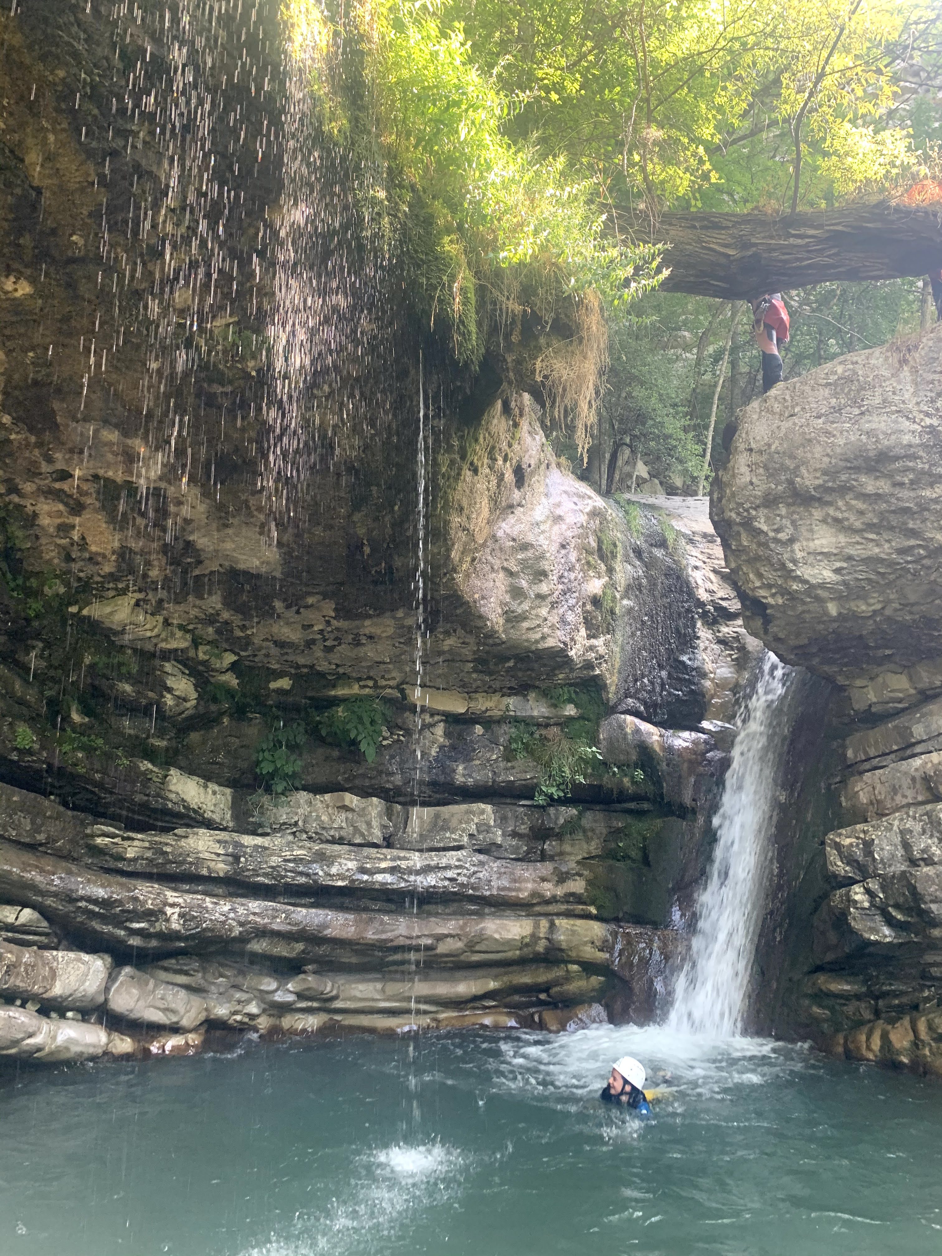 Un autre toboggan, puis un autre que l’on fera cette fois-ci la tête la première, puis sur le dos, puis accroché à une corde avant que notre guide ne nous lâche pour que l’on prenne un tremplin pour finir dans une vasque.