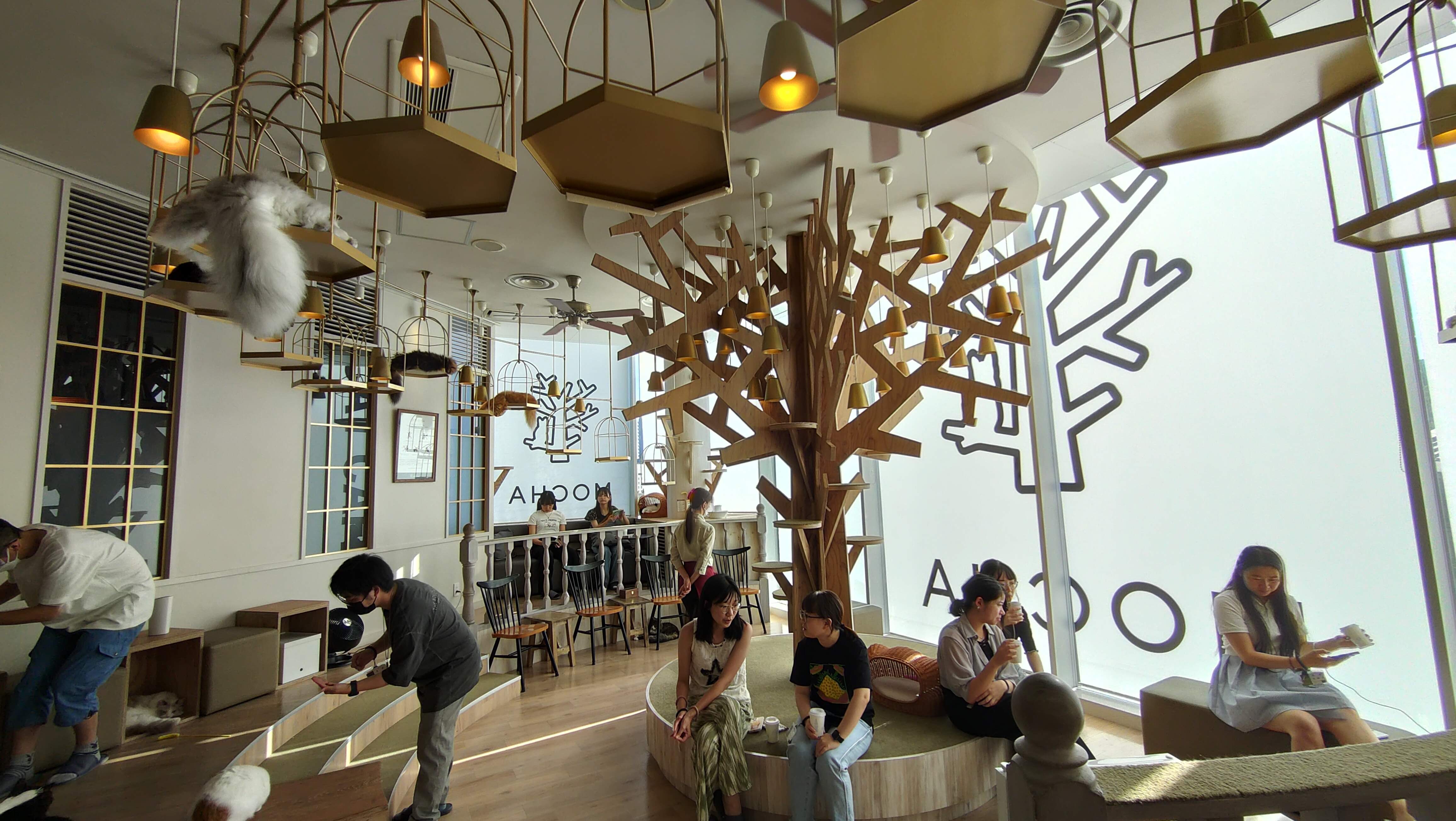 L’ambiance est très calme et l’on voit quelques chats « occupés » à dormir (normal) alors que d’autres se laissent caresser ou se promènent. Dans un coin, il y a même une bibliothèque ou l’on peut s’installer et lire avec un chat que les genoux. Si l’on souhaite attirer quelques amis à quatre pattes, rien de plus simple, il suffit d’acheter une sucette-friandise et l’on est certain d’attirer quelques matous.
