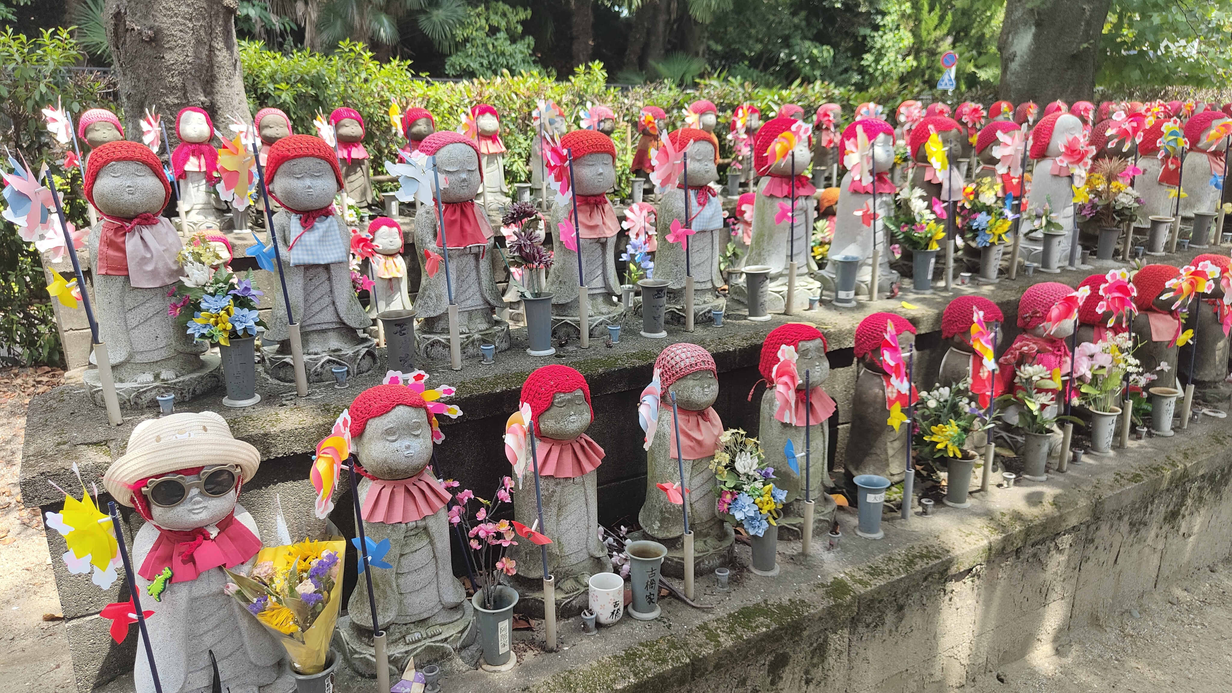 En venant de la tour, nous ne passons pas par l’imposante porte et nous arrivons directement au niveau des dizaines (centaines ?) de statues Jizo dédiées aux enfants. Elles sont toutes habillées avec de petits bonnets et des écharpes et la plupart ont des moulins à vent voire même des lunettes de soleil. L’ensemble est très sympathique.