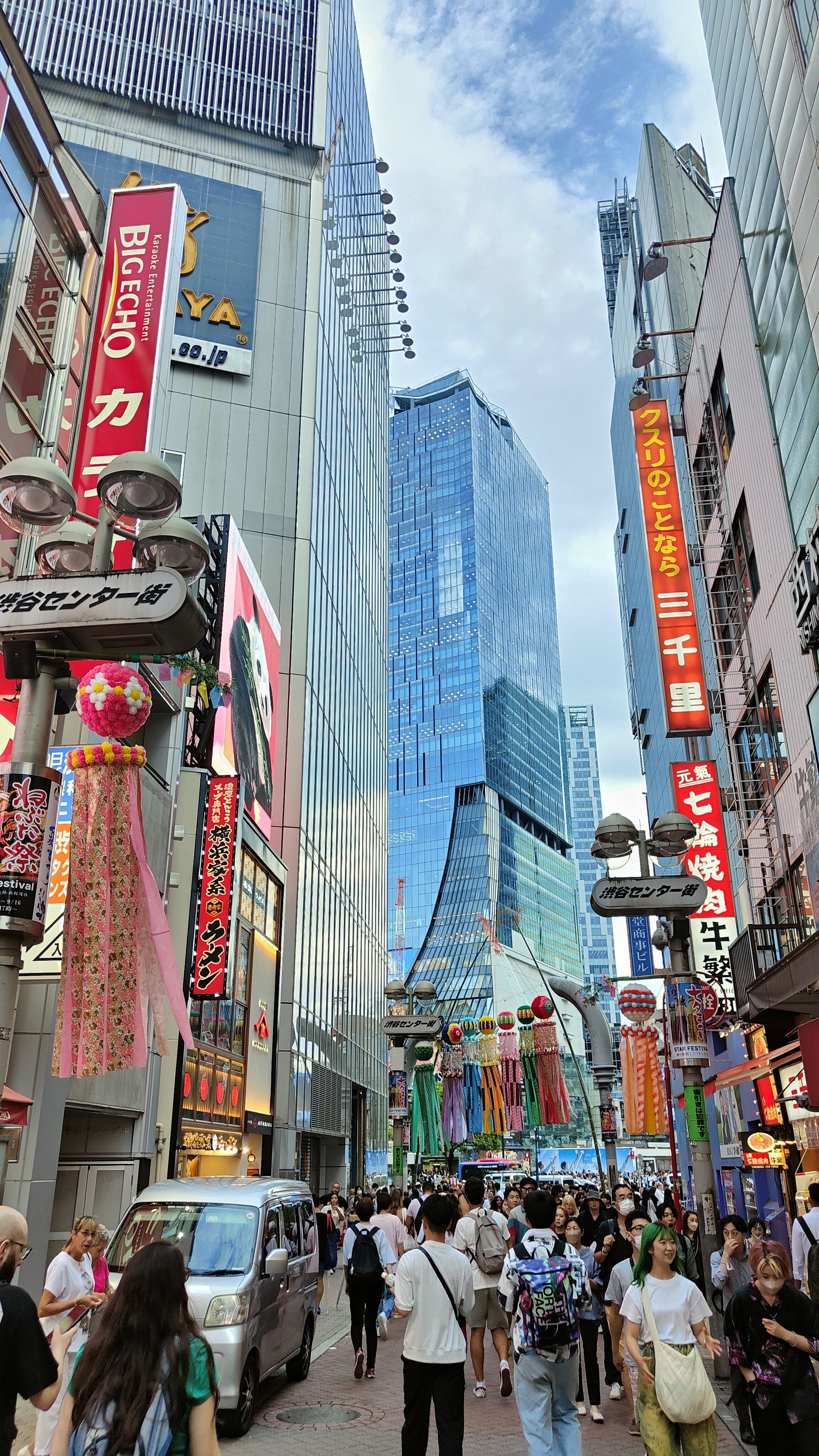 En sortant par l’une des nombreuses sortie de l’immense gare, nous tombons encore une fois sur un panneau publicitaire en fausse 3D au sommet de l’un des bâtiments. Beaucoup d’animation, de couleur, de magasins et de restaurants dans ce quartier. Cela tombe bien, nous cherchons à déjeuner. Nous entrons dans un petit restaurant de ramen et mangeons, encore une fois, pour trois fois rien.