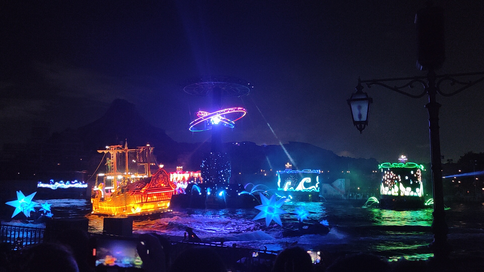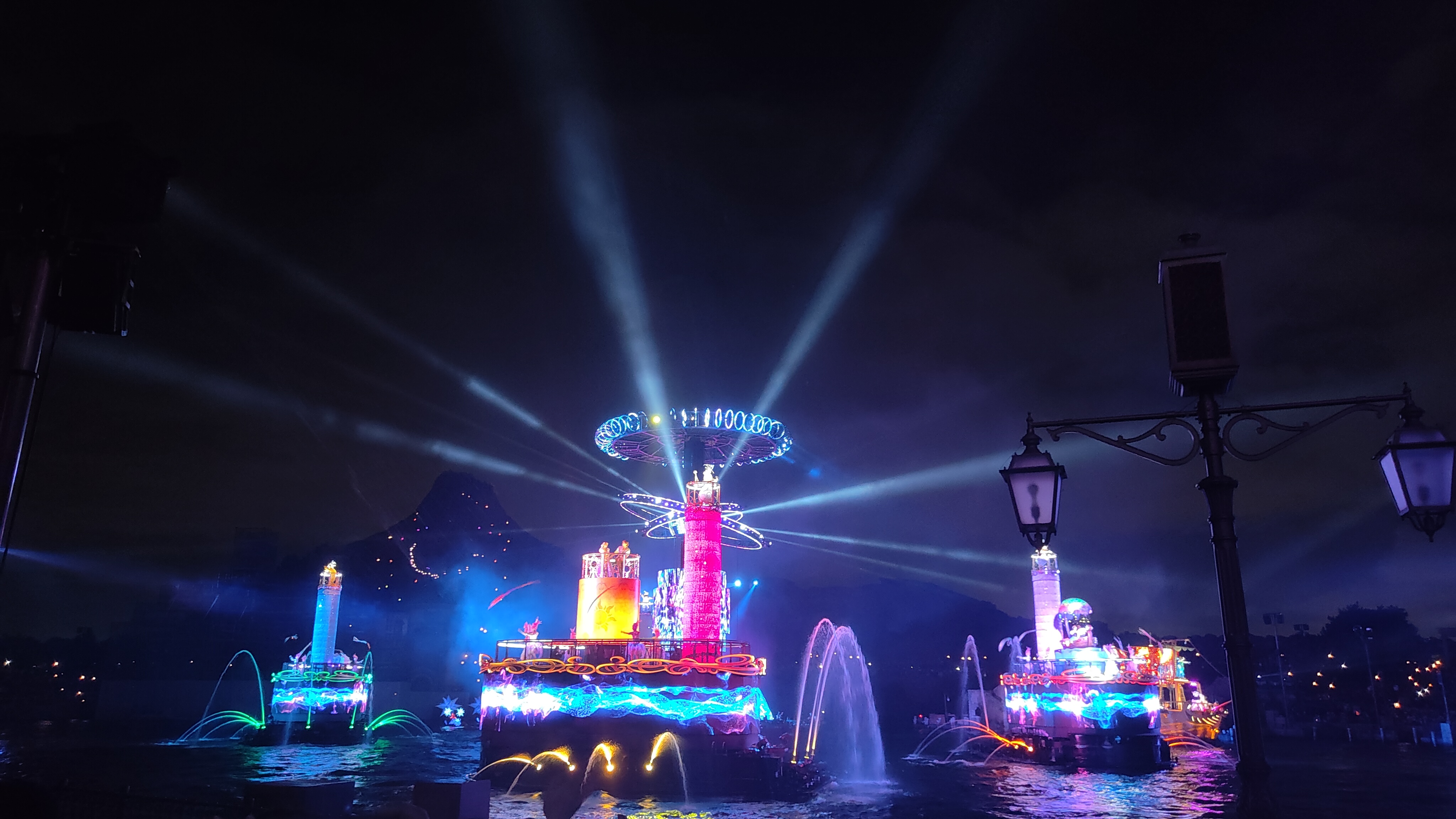 C’est le spectacle du soir. Il se déroule sur le lac autour d’une tour qui sert de support à de nombreux effets de lumière, pyrotechniques, etc. Des bateaux défilent avec des personnages dessus et des écrans en suivant une sélection de films Disney et Pixar.