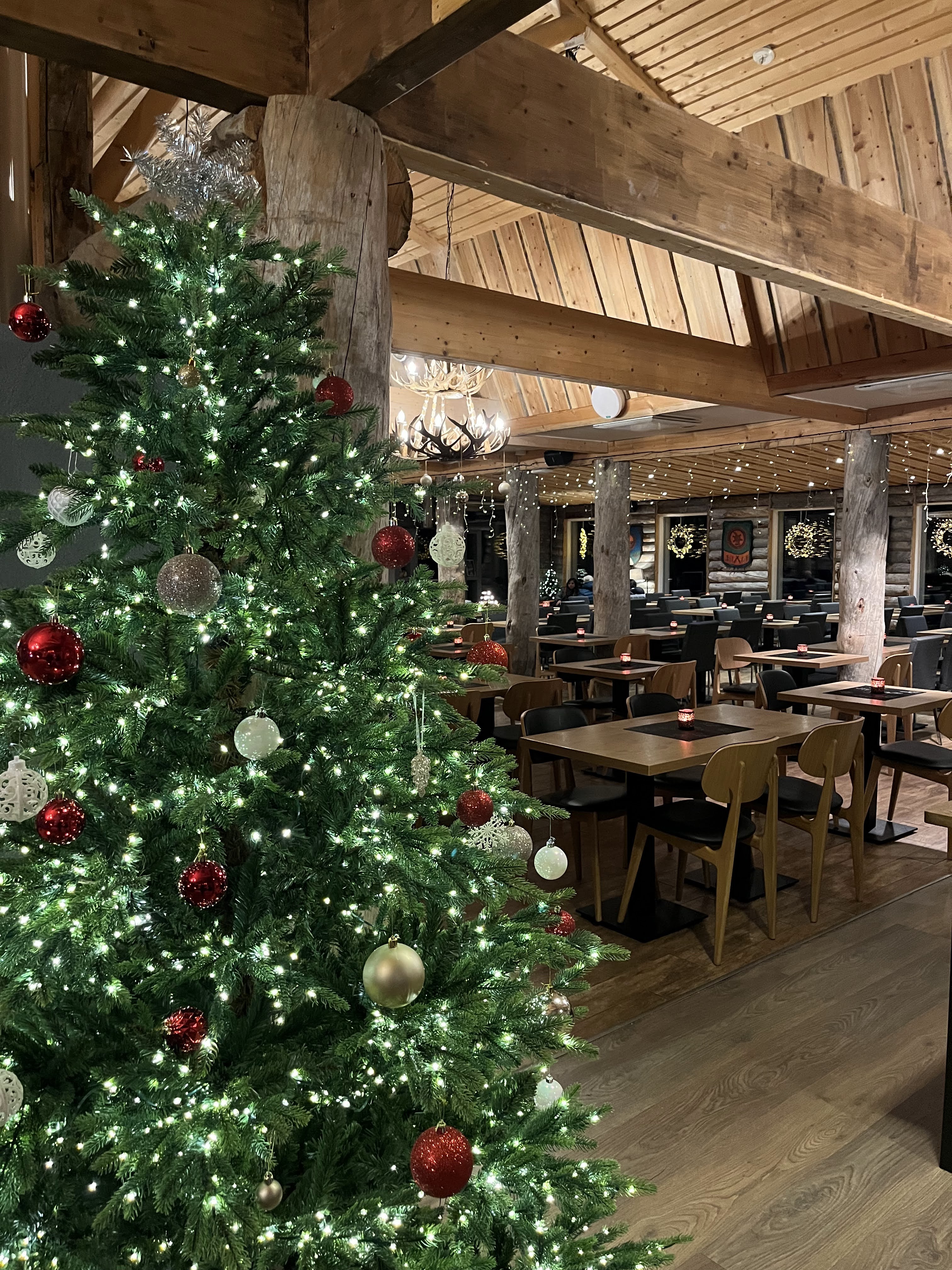 En arrivant, nous sommes en pleine ambiance de Noël. Les guirlandes sont de sorties et égaient l’hôtel. Il est 15h30 et il fait donc nuit.