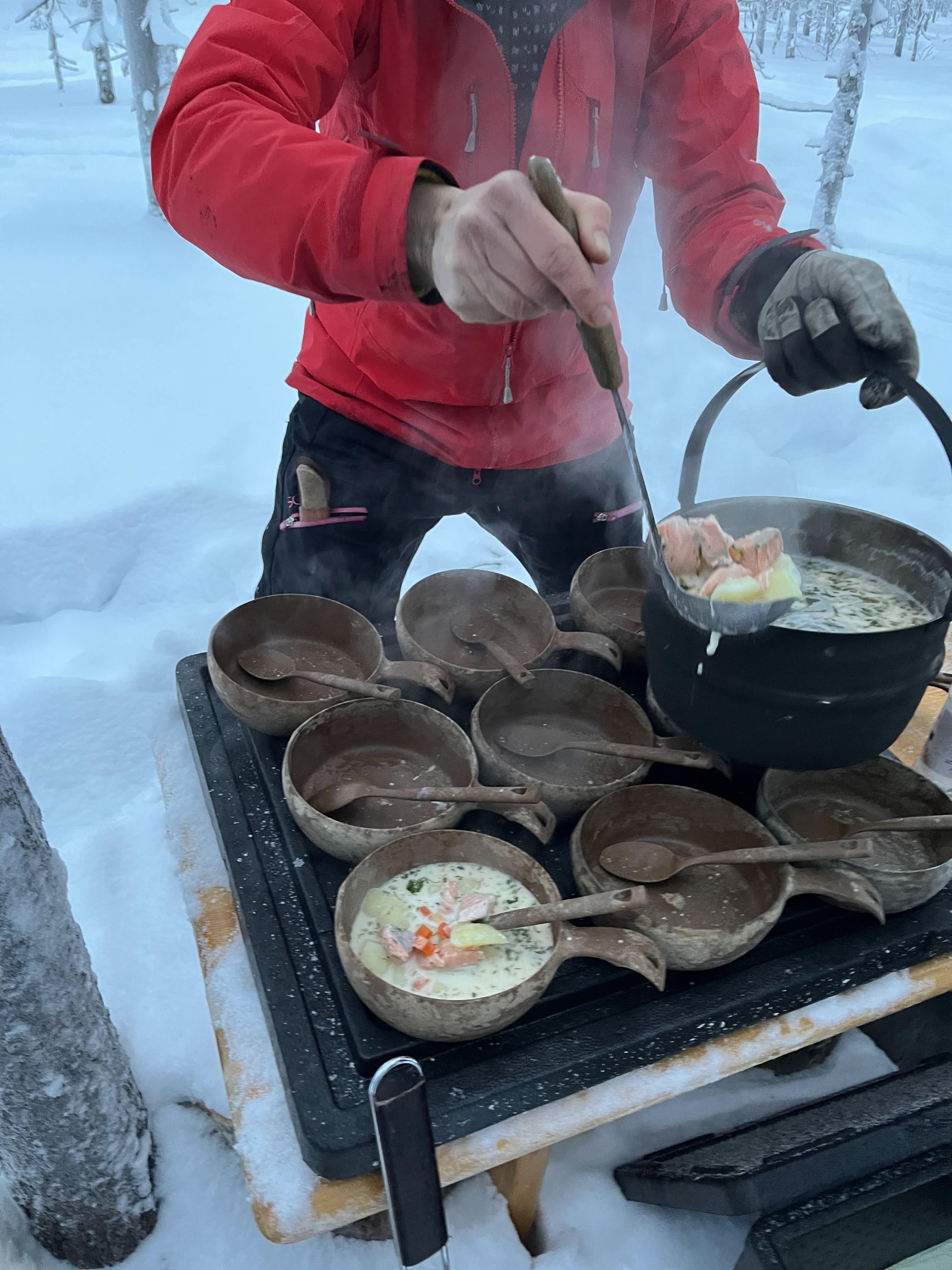 Nous repartons ensuite de la ferme à bord de nos motoneiges pour aller déjeuner dans un chalet où l’on nous sert au choix une soupe de champignons ou d’élan. Le tout accompagné de biscuits. C’est une pause sympathique.