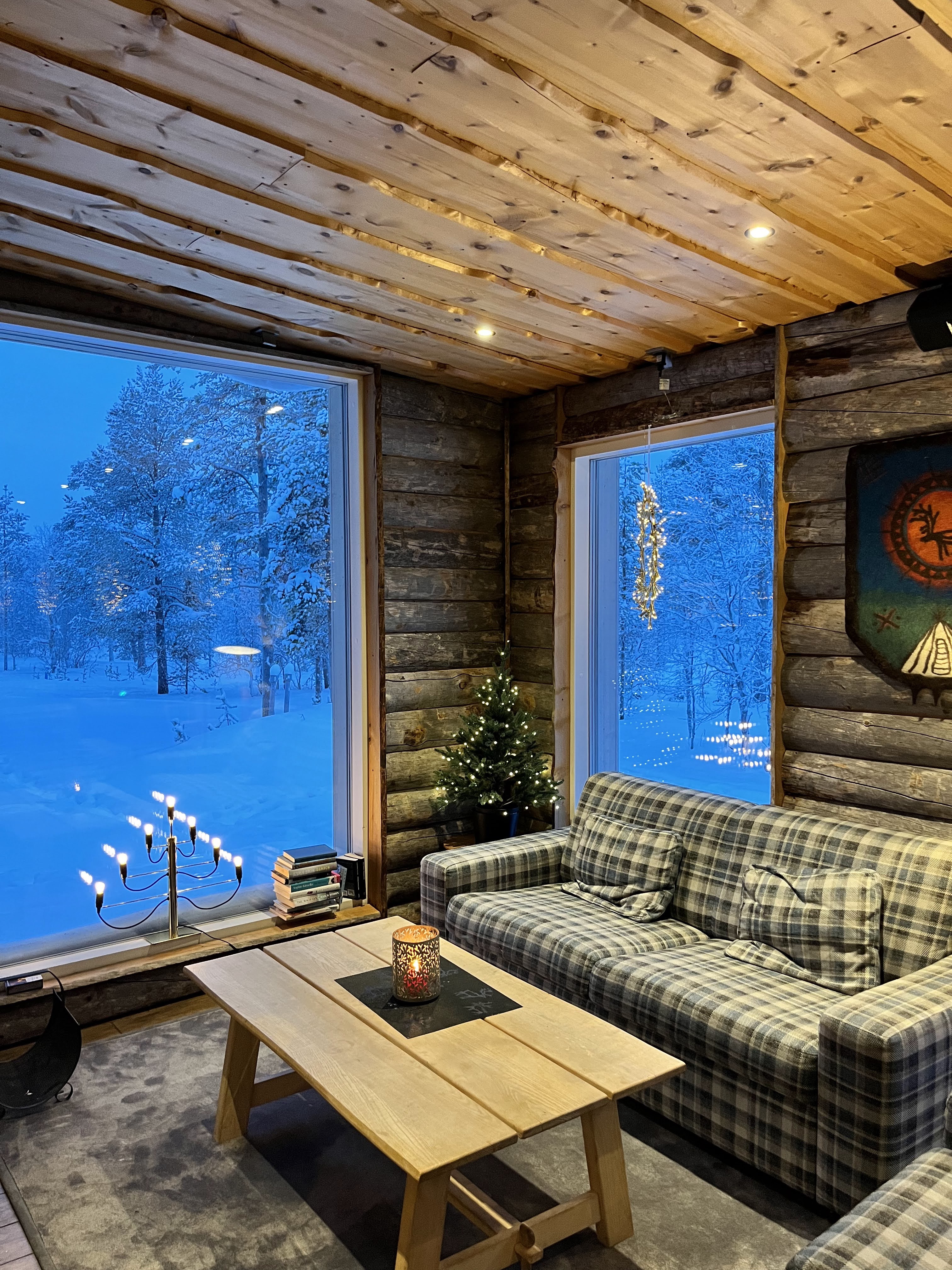 La salle principale est très chaleureuse avec des canapés et des fauteuils où se prélasser en revenant des activités. C’est aussi ici qu’il y a du Wifi, mais notre forfait mobile couvrant la Finlande, nous n’en aurons pas besoin. Point intéressant : la couverture mobile est excellente, même dans la forêt.