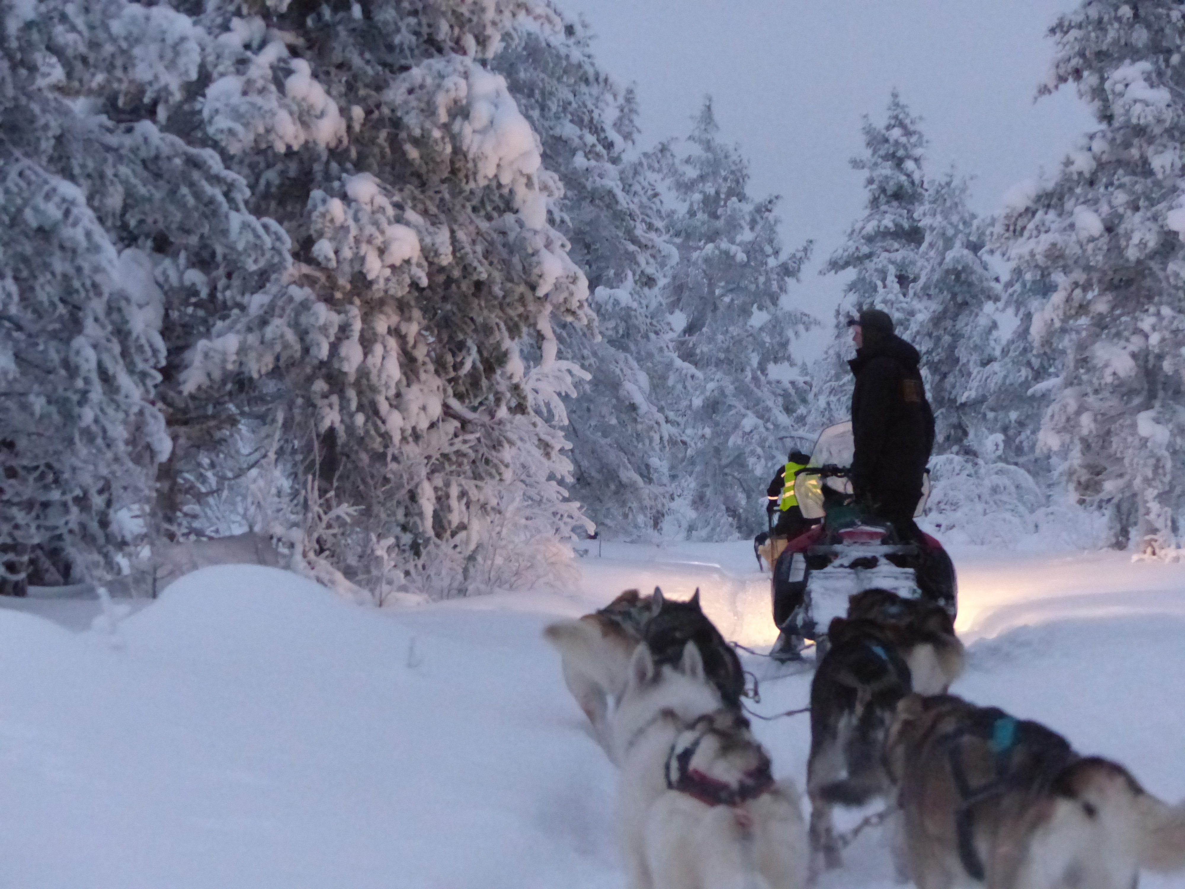Nous sommes très bien encadrés par des guides en motoneige et nous voici partis, un passager et un conducteur. Très tôt, une grande montée et il faut en effet courir pour aider les chiens à monter.