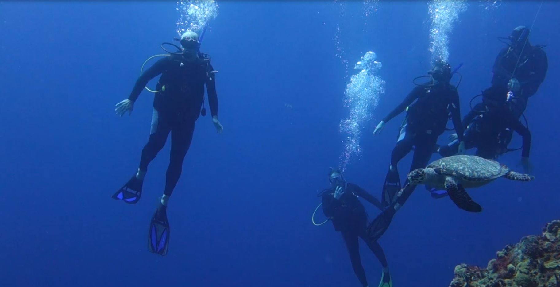 Le temps de choisir une combinaison à notre taille et nous voilà avec une bouteille d’oxygène sur le dos et des palmes aux pieds.