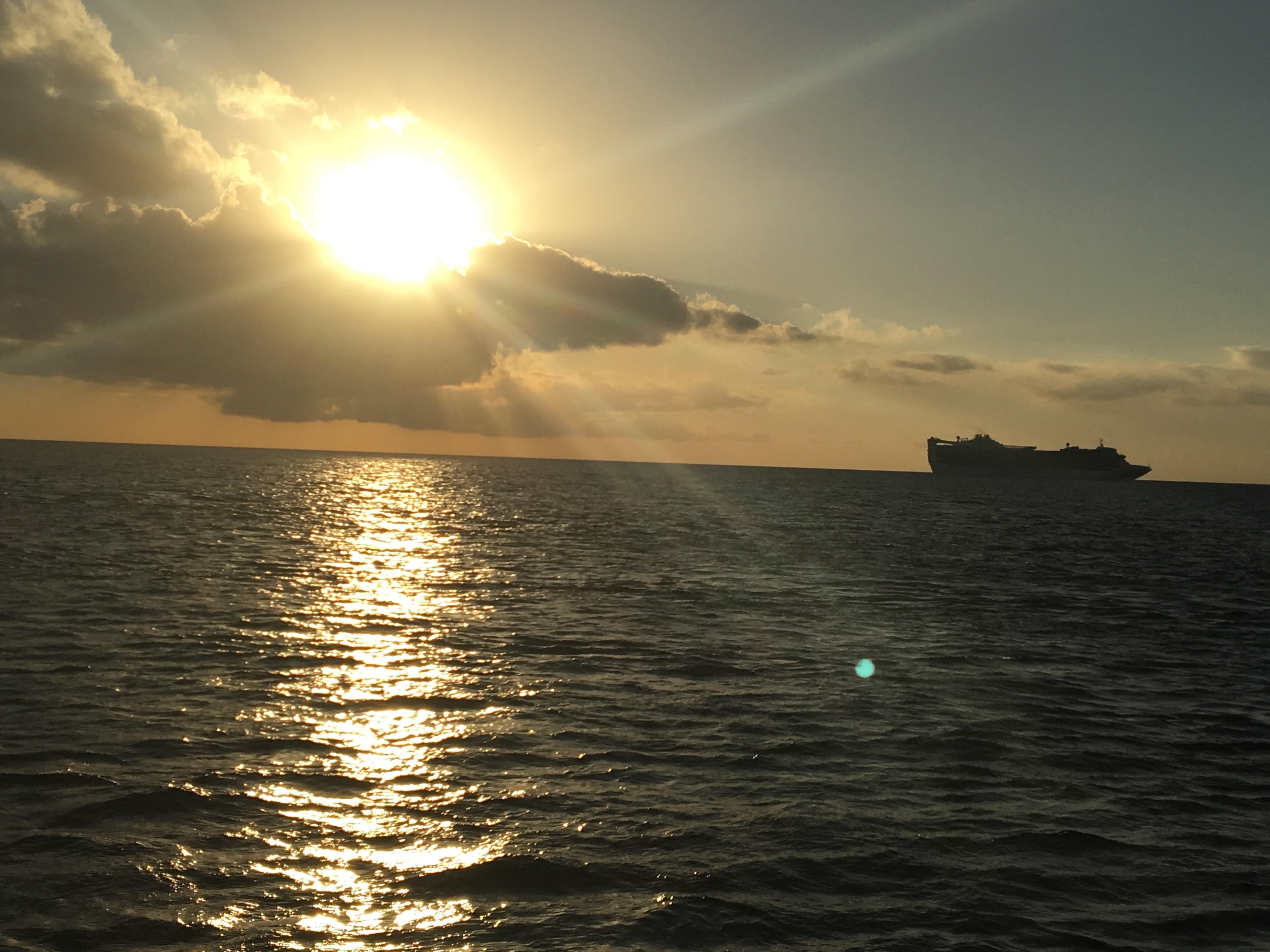 Pas de passage par l’hôtel cette fois-ci, les bateaux nous ramènent directement au quai. Là, nous reprenons le ferry pour Playa del Carmen alors que le soleil se couche et qu’un navire de croisière appareille.