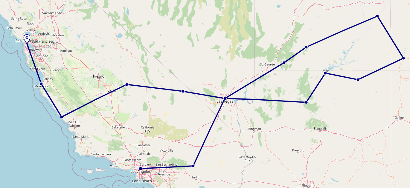 Nous passerons par les principaux parcs naturels de l’Ouest Américain et ferons deux arrêts à Las Vegas. Pourquoi deux arrêts ? Principalement pour réduire les distances dans nos étapes sinon cela ferait trop de route. Et ce sera aussi l’occasion de visiter deux quartiers différents.