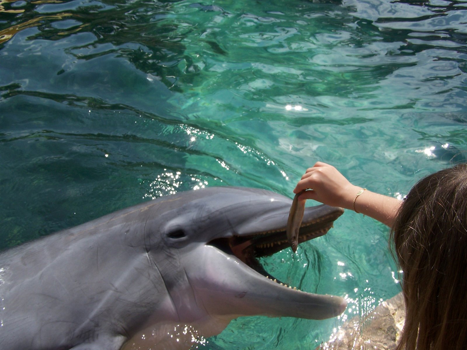 Nous avons eu la chance d’y être pendant qu’on pouvait leur donner à manger. Julie a donc pu donner à manger aux dauphins et au passage les caresser. Elle était aux anges !