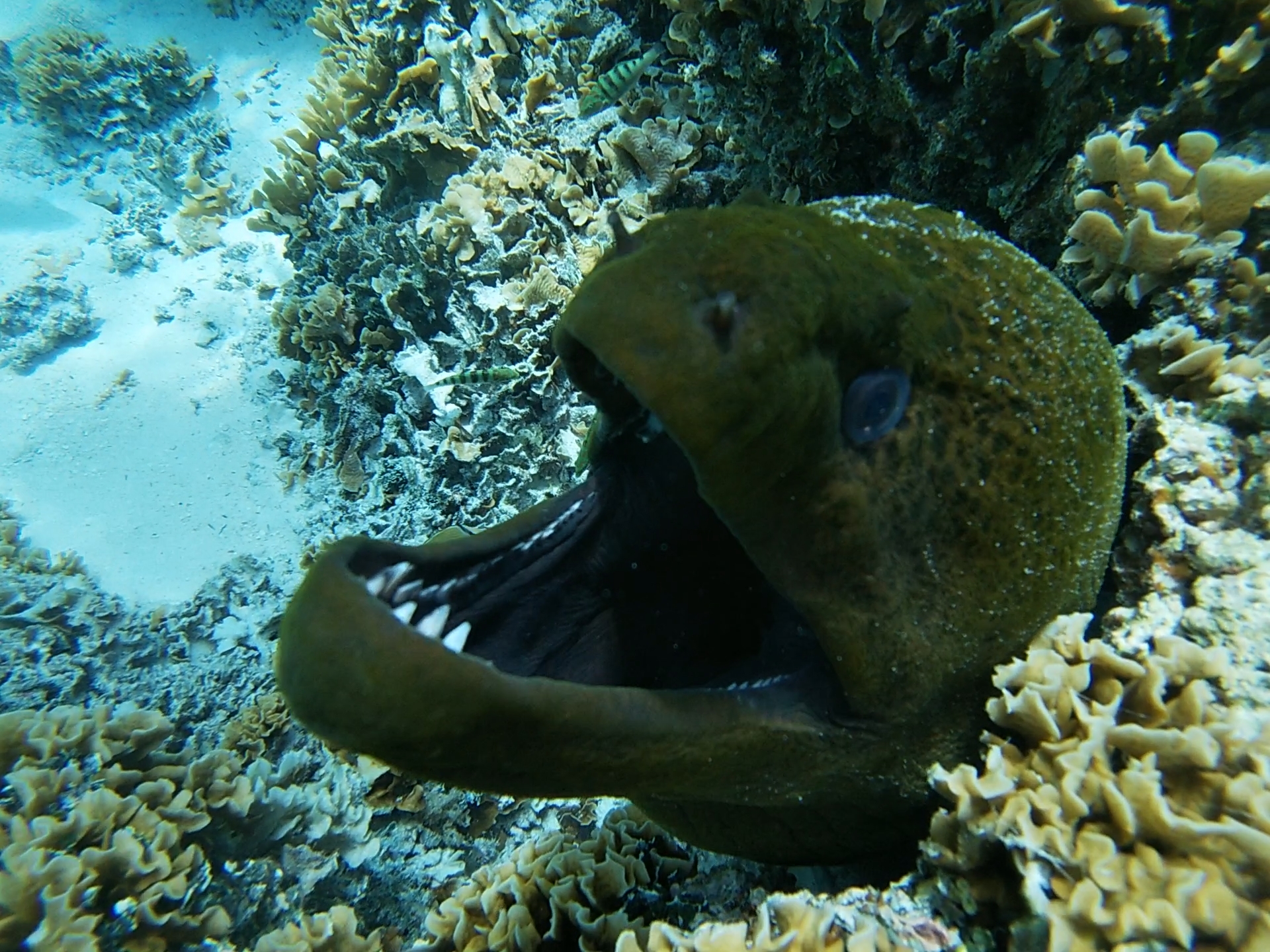 Rosto nous emmène vers un rocher, entouré de poissons, puis plonge. Soudain une murène sort de sa tanière. Rosto la taquine pour la faire sortir, c’est assez impressionnant. Il nous dit que celle-ci, la plus grosse, n’est pas très agressive mais qu’il y en a une autre plus petite qui est moins patiente. Elle ne semble pas être là aujourd’hui, en tout cas elle ne se montre pas.
