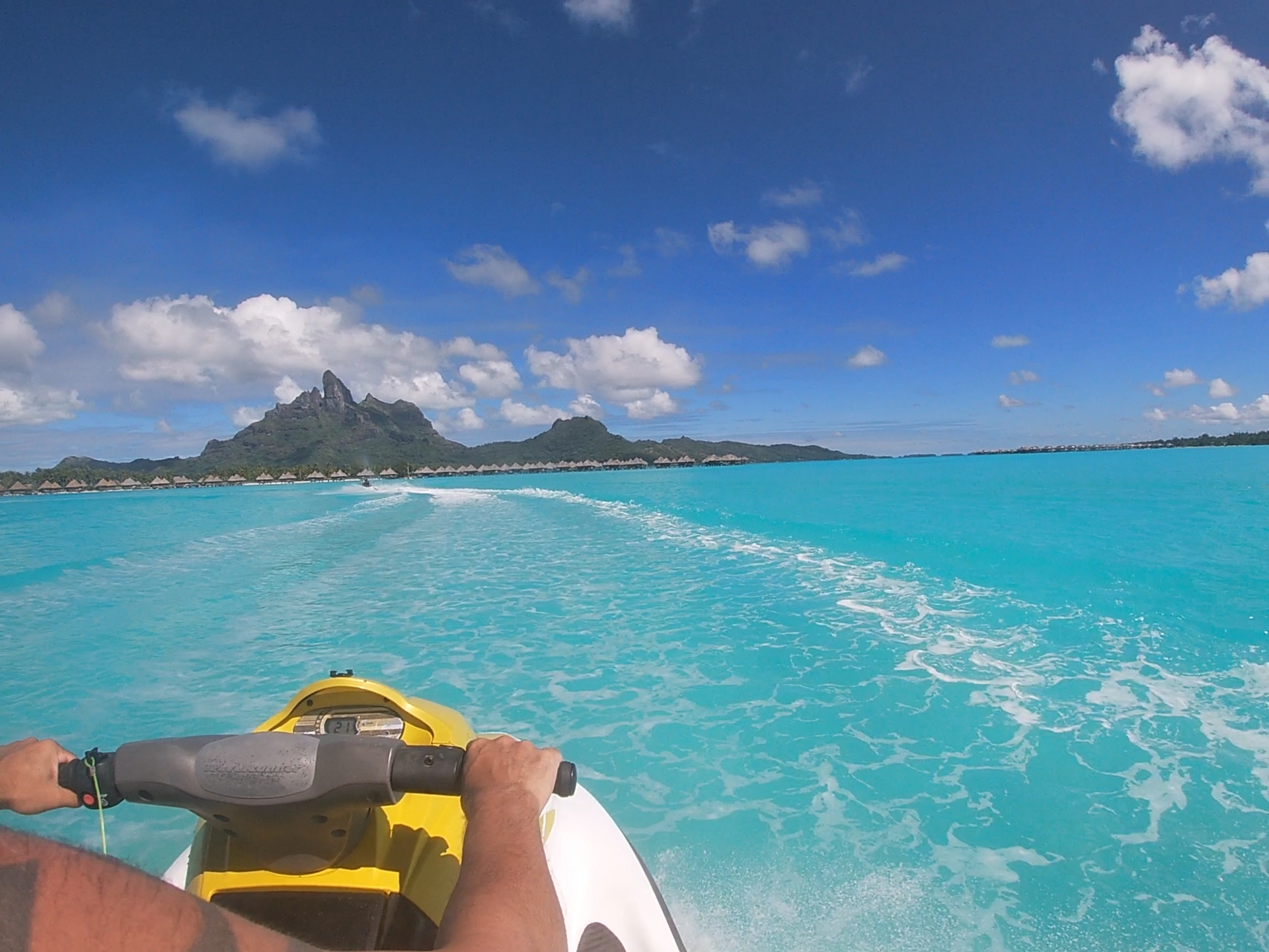 C’est notre troisième session de jet-ski et nous commençons à bien prendre le pli. Après un échauffement dans la baie de Faanui, où les eaux sont profondes, nous partons plein sud.