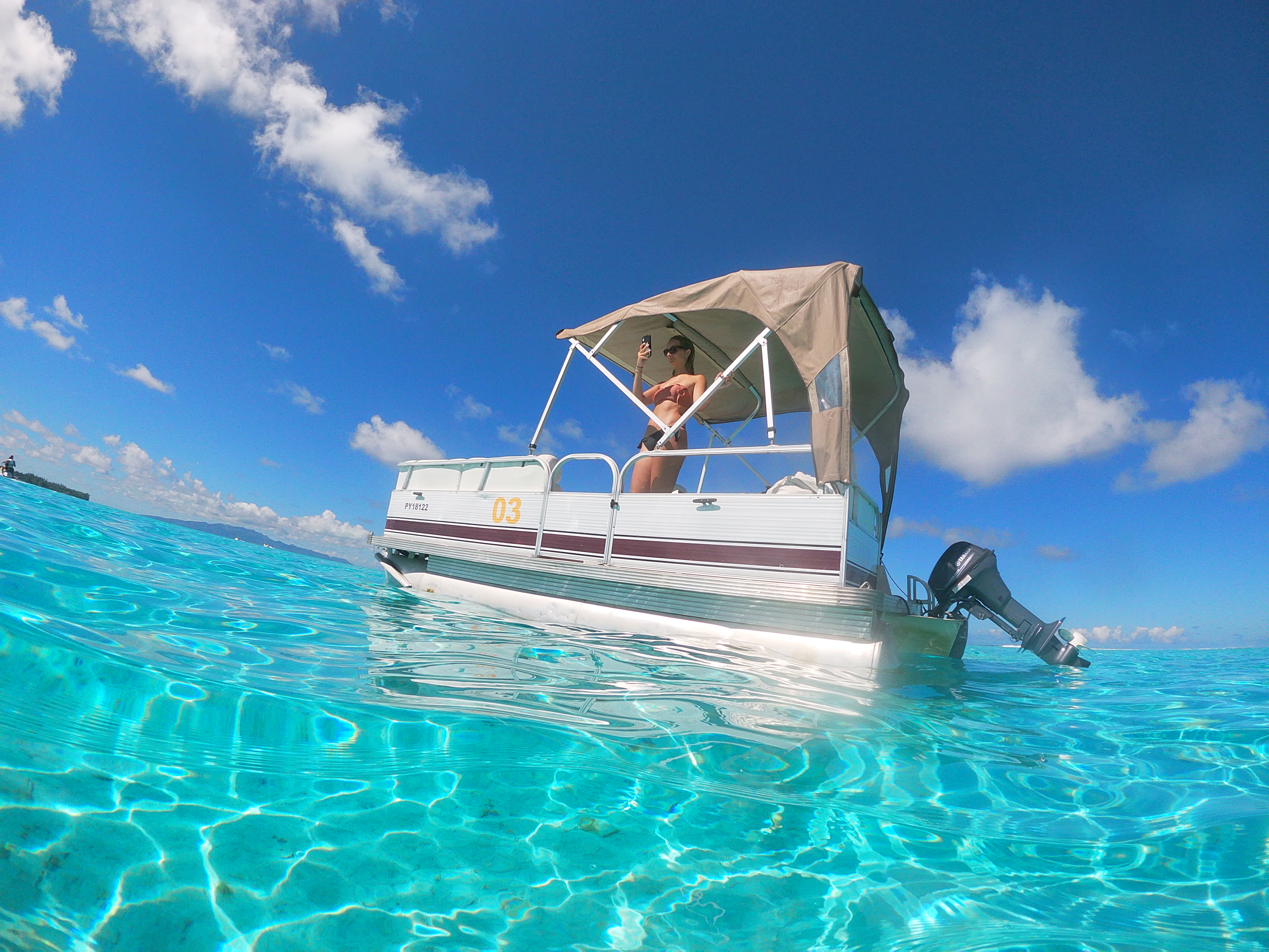 Alizée, notre guide, est adorable. Elle nous explique que l’on devra suivre son sillage pendant toute la durée du tour. Pas de sortie en dehors du lagon comme à Tahiti donc pas de navigation « libre ». Nous nous installons et c’est parti !
