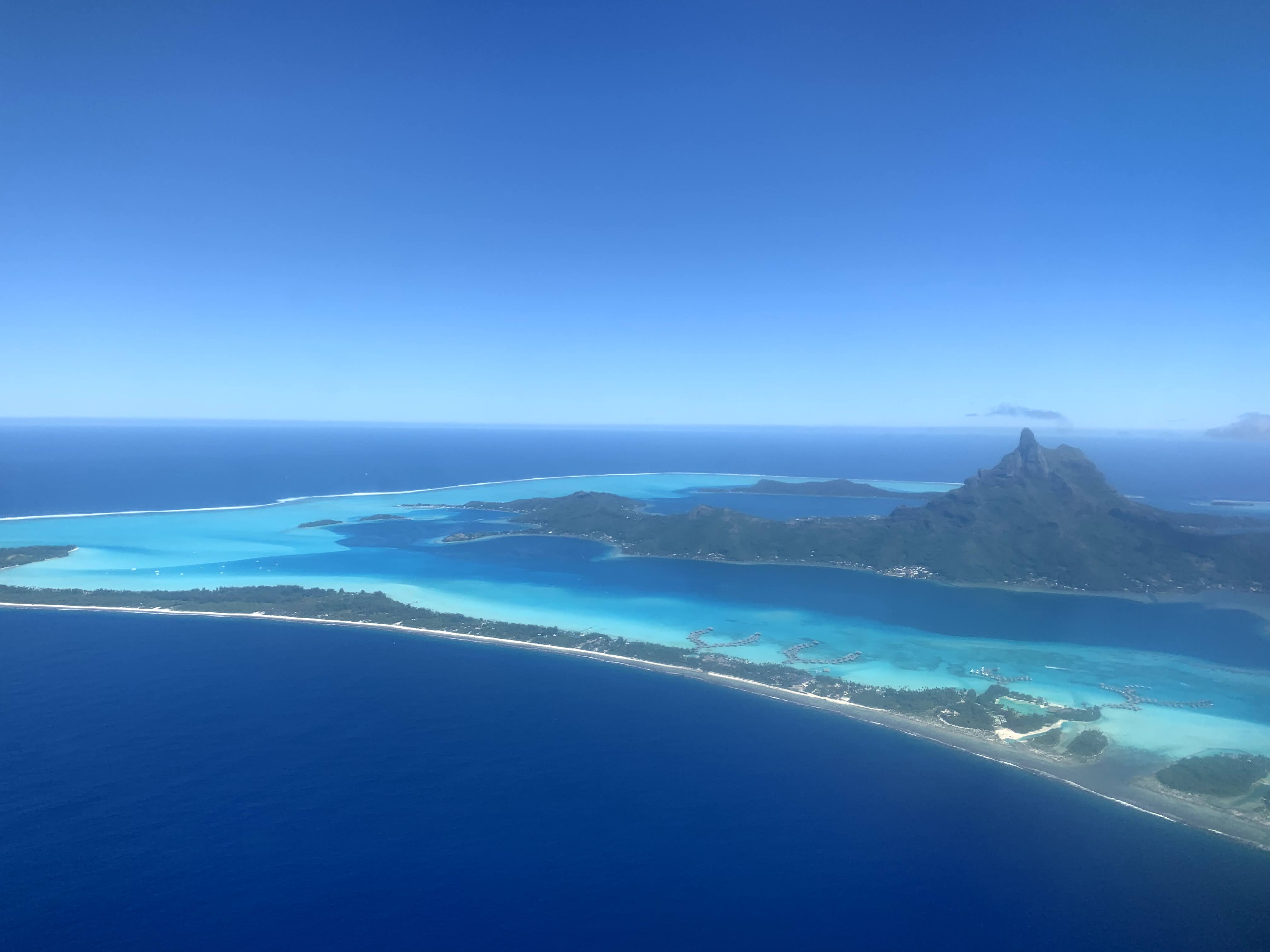 Dans l’avion, on nous a conseillé de nous installer à gauche pour avoir la vue sur l’ile en approchant. En effet, le spectacle vaut le coup ! L’avion dépasse l’ile puis fait demi-tour pour se poser sur le motu-aéroport. Il ne doit pas y avoir beaucoup d’aéroports qui offrent une telle vue.