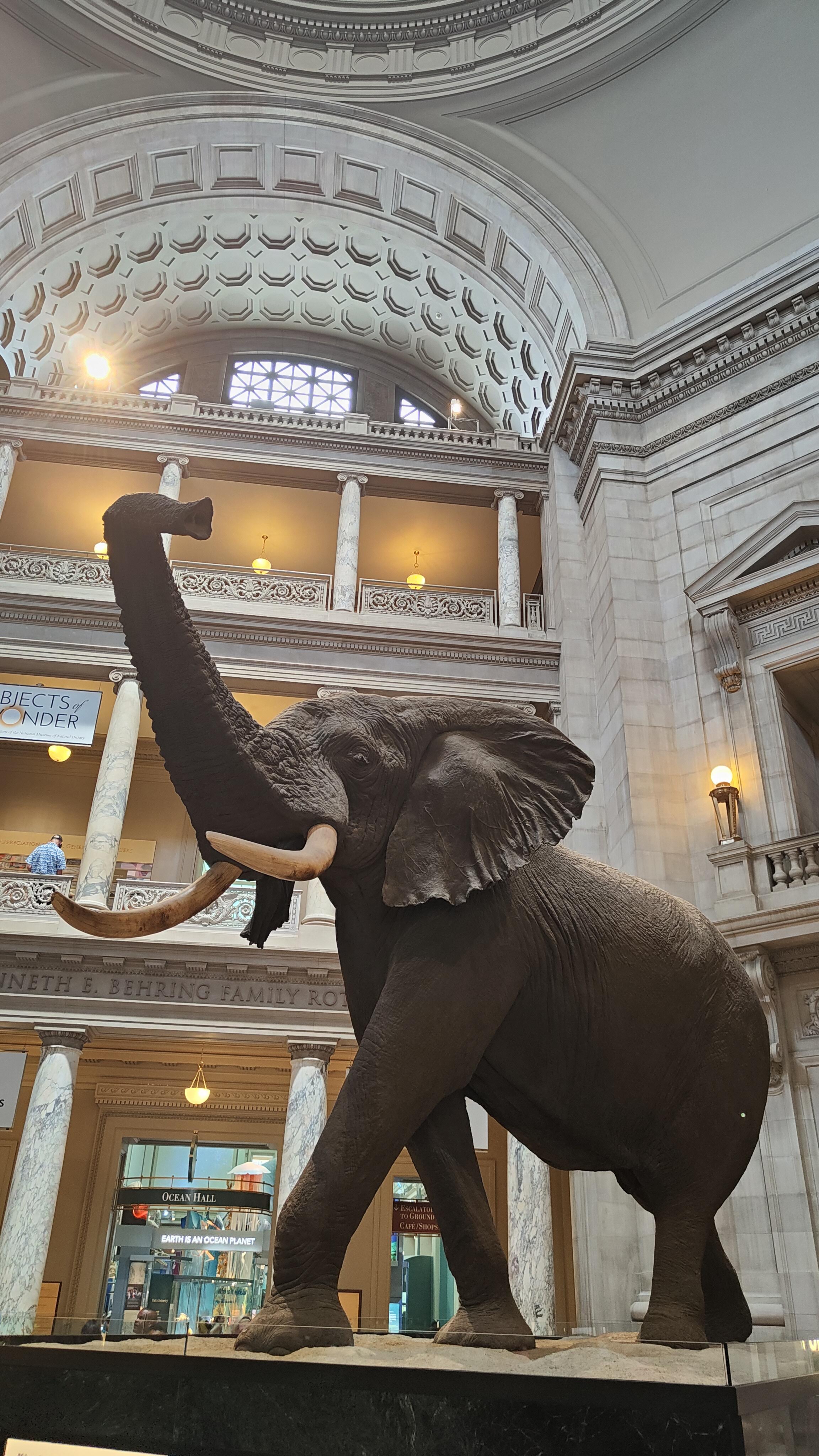 Nous descendons le Mall et trouvons refuge sur un banc à l’ombre. Nous nous sommes levés très tôt et sommes accablés par la chaleur. Arrivés au niveau du Bâtiment de la Smithsonian Institution, nous décidons de traverser et d’aller, au frais, au National Museum of Natural History.